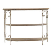 3 Tiered Wooden Shelving Unit With Ornate Iron Frame - Multicolor
