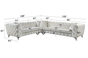 - Construction Details: This sectional features pocket coil seating with KD legs, a wooden inner frame, and metal legs. It includes accent pillows, a tight back, and a loose seat cushion with button tufting for added style.