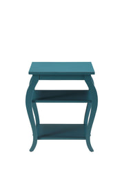 - Design and Structure: The Becci Teal Finish Accent Table features a square leg design with two open shelves for convenient storage. It includes a wooden square top and shelves without an apron, supported by elegant wooden cabriole legs.