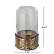 Boho Handcrafted Mango Wood Hurricane Candle Holder With Tempered Glass And Metal Accents - Brown