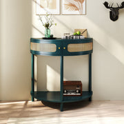 Boho Rattan Semi Circle End Table With Sliding Rattan Door, Elegant Entryway Console With Storage And Bottom Shelf - Antique Green