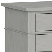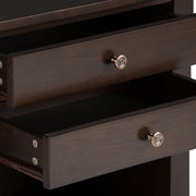 • Transitional design includes defined double molded top, tapered table legs, flat panel drawer fronts and antique bronze rounded decorative handles