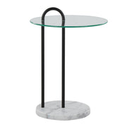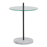 - Material and Finish: The table combines a clear glass top with a black metal frame and a white marble base, offering a sophisticated and stylish look.