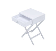 - Elegant Design: The table features a rectangular wooden top and drawer in a clean white finish, enhanced by a sleek chrome metal "X" base, offering a modern and sophisticated look for various interiors.