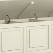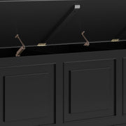 • Features a lift-up lid with child safety hinges that opens to reveal three large storage compartments
