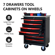 7 Drawer Multifunctional Tool Cart With Wheels, Metal Rolling Tool Cart Storage For Garage Workshop Warehouse Repair Shop With Stainless Steel Roof - Black / Red