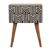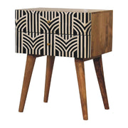 - Solid Wood Edessa Bone Inlay Bedside - This stunning boho-inspired bedside table is crafted from 100% solid mango wood and features a lovely finish. It also boasts bone inlay on the front drawers and sleek Nordic-style legs. The bone inlay is ethically sourced from deceased animals, including camels, goats, and buffaloes.