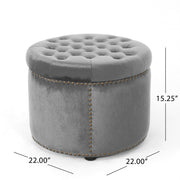 Elegant Round Ottoman Footstool With Velvet Upholstery And Studded Rim - Gray