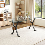 Elegant Tempered Glass Dining Table With X Shaped Metal Legs And Wood Grain Crossbeam - Black / Transparent