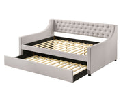 - Design and Features: This daybed includes a slat system, a trundle for additional sleeping space, and is fully upholstered with a button-tufted design. It features solid wooden legs and a sloped shape for added texture and style.