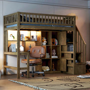 Twin Size Loft Bed With Built In L-Shaped Desk, LED Lights, Storage Shelves, Cabinets, And Staircase - Walnut