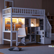 Loft Bed With Built In L Shaped Desk, LED Lights, Storage Shelves, Cabinets, And Staircase