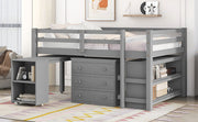 Full Loft Low Study Bed With Cabinet, Shelves And Rolling Portable Desk, Multiple Functions- Gray