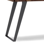 - Modern, industrial design includes discreet hand pulls on drawers and solid metal angled legs for reliable support