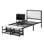 Upgrade your bedroom with this sleek Metal Platform Bed, combining industrial design with modern functionality. The bed features a durable metal frame with soft, comfortable upholstery for ultimate relaxation. With two-tier side storage shelves and a convenient wooden storage cabinet, you'll enjoy ample space to organize your essentials. The cushioned footrest above the storage shelves doubles as a cozy spot to rest your feet at the bed's end.