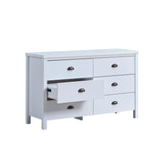 Offering six deep drawers, this dresser provides generous storage capacity for all your clothing and personal items. The wide design is perfect for maximizing closet organization and keeping your space tidy. -