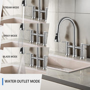 • 360° Swivel: The 3-hole bridge faucet allows comprehensive access to every corner of the sink, eliminating the need for a side-sprayer.