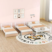 This triple bunk bed is a space-saving solution for multi-child families, featuring a bed over two beds. Its vertical design maximizes space, making it ideal for large families and sleepovers. The with accents adds a modern touch. Built for durability, it includes a desk and three-layer shelves for study and storage, plus two large drawers under the lower beds. This versatile set can be used as a stacked unit or separated into three individual beds to suit your needs.