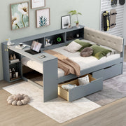 Upholstered Headboard Full Size Platform Bed With Storage Shelves, Drawers, Charging Station - Gray