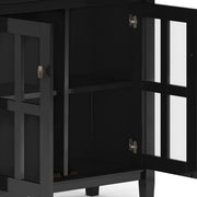 • Features storage compartment with two adjustable shelves behind wood framed tempered glass door