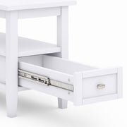 - Features bottom drawer with metal drawer glides and large open shelf for storage