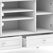 • Features two (2) functional bottom drawers with shaker style drawer front and metal drawer glides, two (2) side doors with storage and one (1) adjustable shelf