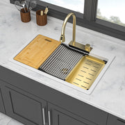 Drop In Waterfall Kitchen Sink With Pull Out Faucet & Cup Washer, 16 Gauge Stainless Steel - White