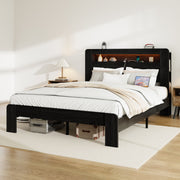 Full Size Platform Bed Frame With Storage LED Light Headboard And USB Ports - Black