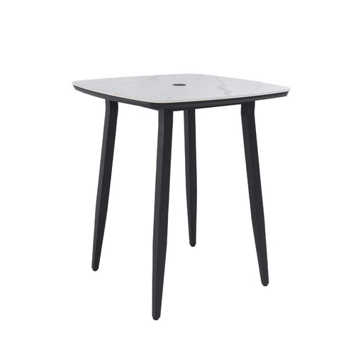 View full detailsModern Outdoor Bar Table, Rounded Square Sintered Stone Top With Umbrella Hole, Rust Free Frame, Weatherproof - Ember Black / White