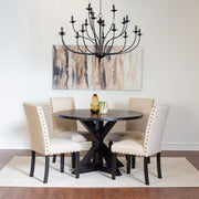 - Elegant and Cozy Atmosphere: Round table with stable cross-buck pedestal base in black finish. Chairs feature fabric upholstery with brass nailheads for a timeless look.