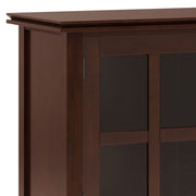 • Transitional Style includes clean angle edged table top, mullion framed tempered glass doors, rectangular antique bronze knobs and square legs