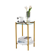 2-Layer End Table With Tempered Glass And Marble Tabletop, Round Coffee Table With Golden Metal Frame For Bedroom Living Room Office - White