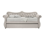 - Design Features: The Adkins Beige Linen Daybed boasts a sophisticated design with button tufted detailing and nailhead trim accents, offering an elegant touch to any room. Its wooden legs and fully upholstered frame provide a classic and stylish appearance.