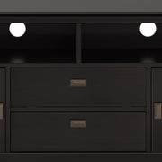 - Features a large centrally located open area with one (1) flip down drawer, one (1) pull out drawer as well as four (4) storage spaces with tempered glass doors.