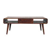 - Avora 2 Drawer Chestnut Coffee Table - A seamless fusion of mid-century charm and modern practicality, this coffee table is handcrafted from 100% Solid Mango Wood in a rich chestnut finish. Its sleek, curved design features two drawers on both sides, offering ample storage for keeping your space organized, while the open compartments provide easy access to everyday essentials. Resting on elegantly tapered Nordic-style legs, this piece exudes timeless sophistication and durability. Perfect as a stylish centerpiece, it brings warmth, functionality, and artisanal craftsmanship to any living space.