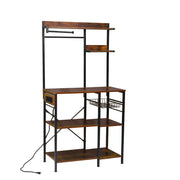 Bakers Rack With Power Outlet, Coffee Bar With S-Shaped Hooks, Kitchen Shelf With Wire Basket - Black / Brown