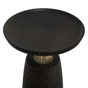 - Features spacious round tabletop, antique gold look stem and distinctive textured finish