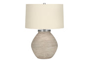 - Elegant Design: This 25-inch contemporary table lamp features an elegant jar-shaped base with a cream concrete texture and fine lined ridges, topped with a beige linen drum shade and a round silver finial.