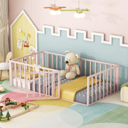 Twin Size Floor Bed Frame With Fence And Door - Pink