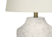 • Modern Style: Features a 20" table lamp with a classic urn-shaped base and a ridged cream concrete textured finish, topped with an ivory linen tapered drum shade and a gold finial.