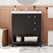- Elegant Design: Transform your bathroom with a 30-inch transitional style vanity cabinet, featuring golden handles and a white ceramic sink that offer a captivating visual experience.