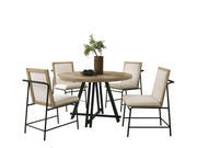 - The Tate Oak Dining Table Set masterfully combines rustic charm and contemporary design. With its generous 47" round top, this table is perfect for gatherings, offering ample space for guests. The tabletop is adorned with a beautifully distressed oak finish. This finish accentuates the natural wood grain and showcases visible knots, adding an authentic, rustic appeal to your dining space. The metal construction of the metal leg frame provides a striking contrast to the wood top, blending rustic and industrial styles. The dining chairs offer a sophisticated addition to the set with their sleek design. The incorporation of a back bar handle is not only a unique design element but also provides practicality, allowing for easy movement of the chair. It's a great choice for both traditional and contemporary dining rooms, providing a warm, welcoming ambiance.