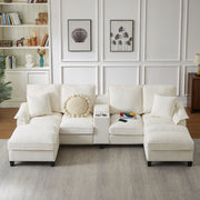 U Shaped Sectional Sofa Bed With Storage, 4 Seater, Features Cup Holders And Soft Foam Cushions - Beige