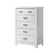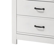 - The elegant and functional Cassini White 5-Drawer Chest offers generous storage space with its five spacious drawers, allowing you to neatly organize and store your belongings. Featuring sleek black handles, the drawers of this chest are not only easy to access but also add a touch of sophistication to its overall design. A unique visual element with its top drawers is the split design while maintaining their full size. The top surface makes an ideal spot for displaying decorative items, such as a small plant or a cherished photo frame. Each drawer provides ample space to store clothing, accessories, or other essentials. Elevate the organization and aesthetics of your home with this versatile and stunning piece of furniture.