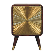 - Avora Brass Embossed 2 Drawer Chestnut Nightstand - An exquisite blend of elegance and artistry, this nightstand is handcrafted from 100% Solid Mango Wood in a rich chestnut finish, beautifully complemented by a striking brass embossing on the front. The intricate sunburst pattern on the cabinet doors, with metallic handles, adds a touch of glamour, while the Nordic-style legs with brass caps enhance its refined aesthetic. Designed with both style and functionality in mind, this piece offers discreet storage for your essentials while serving as a stunning focal point in any bedroom or living space. A true statement of craftsmanship, it seamlessly combines luxury with sustainable design.