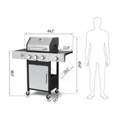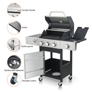 3 Burner Propane Gas Bbq Grill With Side Burner, 37230Btu Output With Enameed Cast Iron Cooking Grids For Outdoor Barbecue, Stainless Steel - Black / Silver