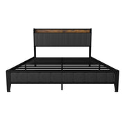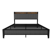 Queen Size Bed Frame With Charging Station, Upholstered Headboard, Metal Platform - Dark Gray