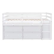 Full Size Loft Bed With Retractable Writing Desk And 4 Drawers, With Lateral Portable Desk And Shelves - White