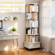 5 Tier Rotating Bookshelf With Wheels And Drawer, 360° Spinning Design, Space Saving Storage, For Home And Office - White